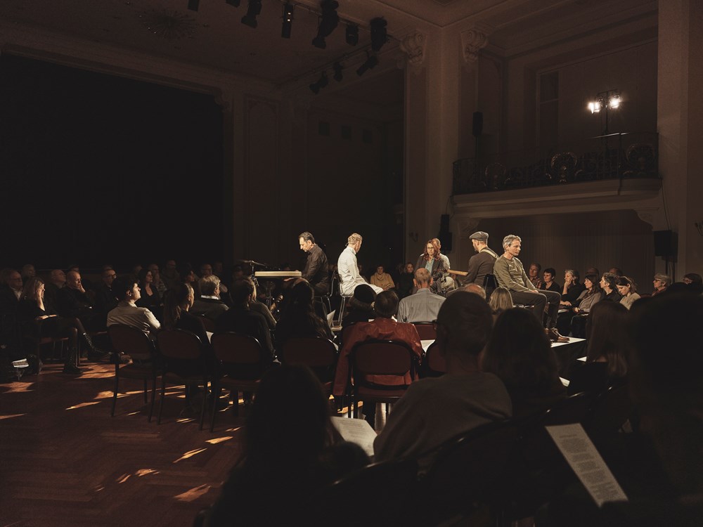 Mit der Richterin Yvonne Summer, dem Theologen Walter Schmolly (krankheitsbedingt eingesprungen für Propst P. Martin Werlen), der Philosophin Ariadne von Schirach, dem Autor Wolfgang Mörth sowie Oliver Rath an der E-Gitarre und Georgios Mikirozis, Percussion. Rezitation: Lukas Kientzler und David Kopp. Licht Folkert Uhde. Produktion Klemens Thaler. Fotos Lucas Breuer.