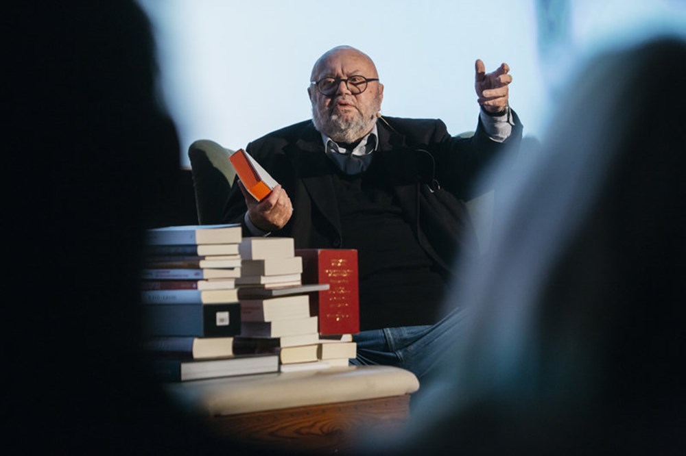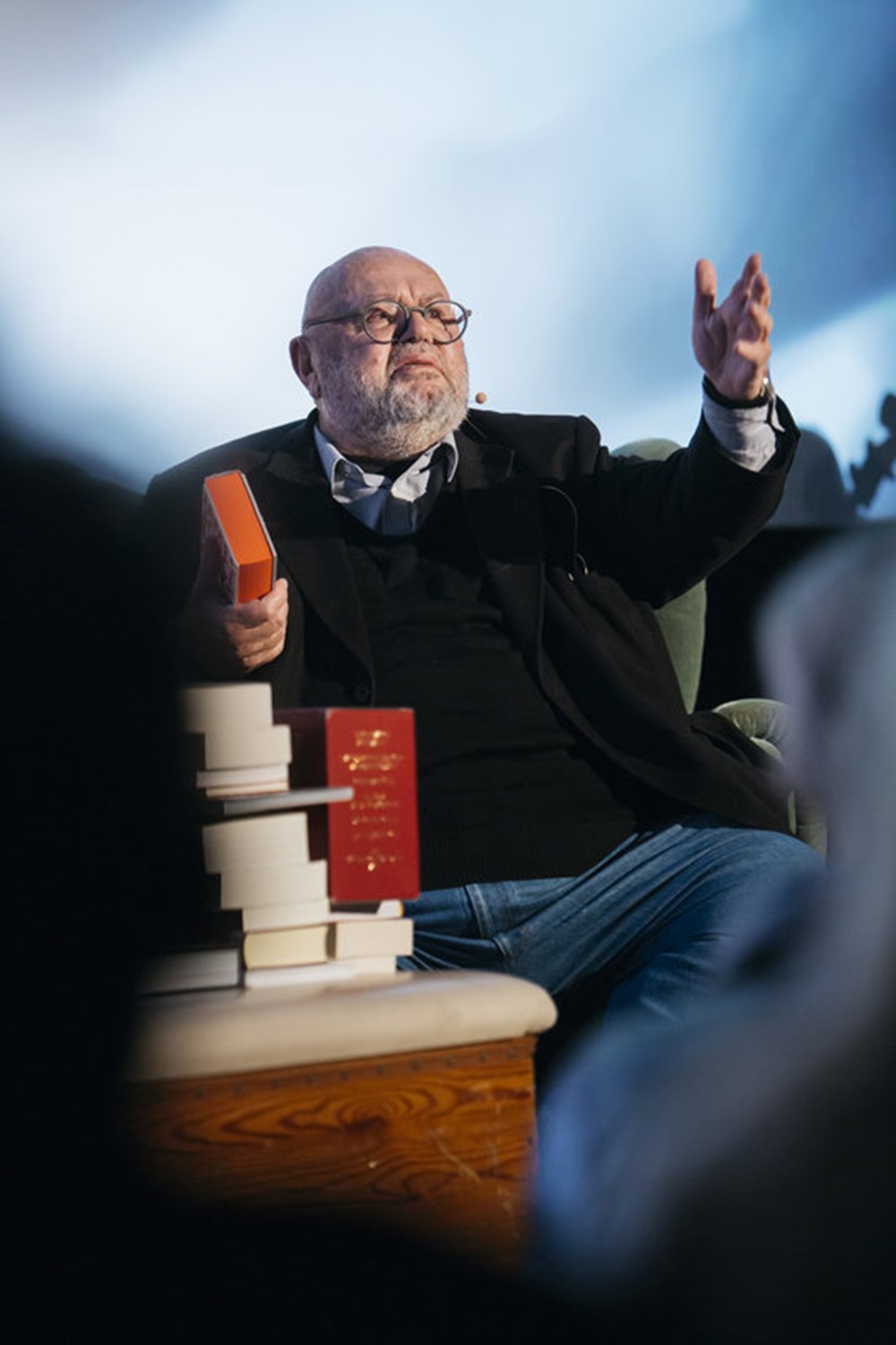 Auf der Bühne befindet sich ein Stapel – dem Akteuer vorher nicht genannter – Bücher rund um das Thema des Festivals: Spät- und Meisterwerke, Unvollendetes, Größenwahnsinniges, Perfektionistisches, Gescheitertes.