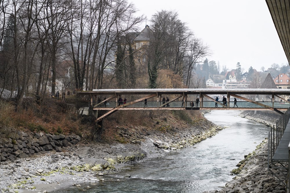 Die Verwandlung einer bestehenden Brücke als kontemplative Rauminstallation. Rund 30 Sekunden benötigt man, um über den hölzernen Ganahl-Steg in Feldkirch von einem Ufer zum anderen zu kommen. 30 Sekunden Zeit für eine Glaubensfrage, die jeweils am Ende der Brück auftaucht. Der Steg führt nach innen.