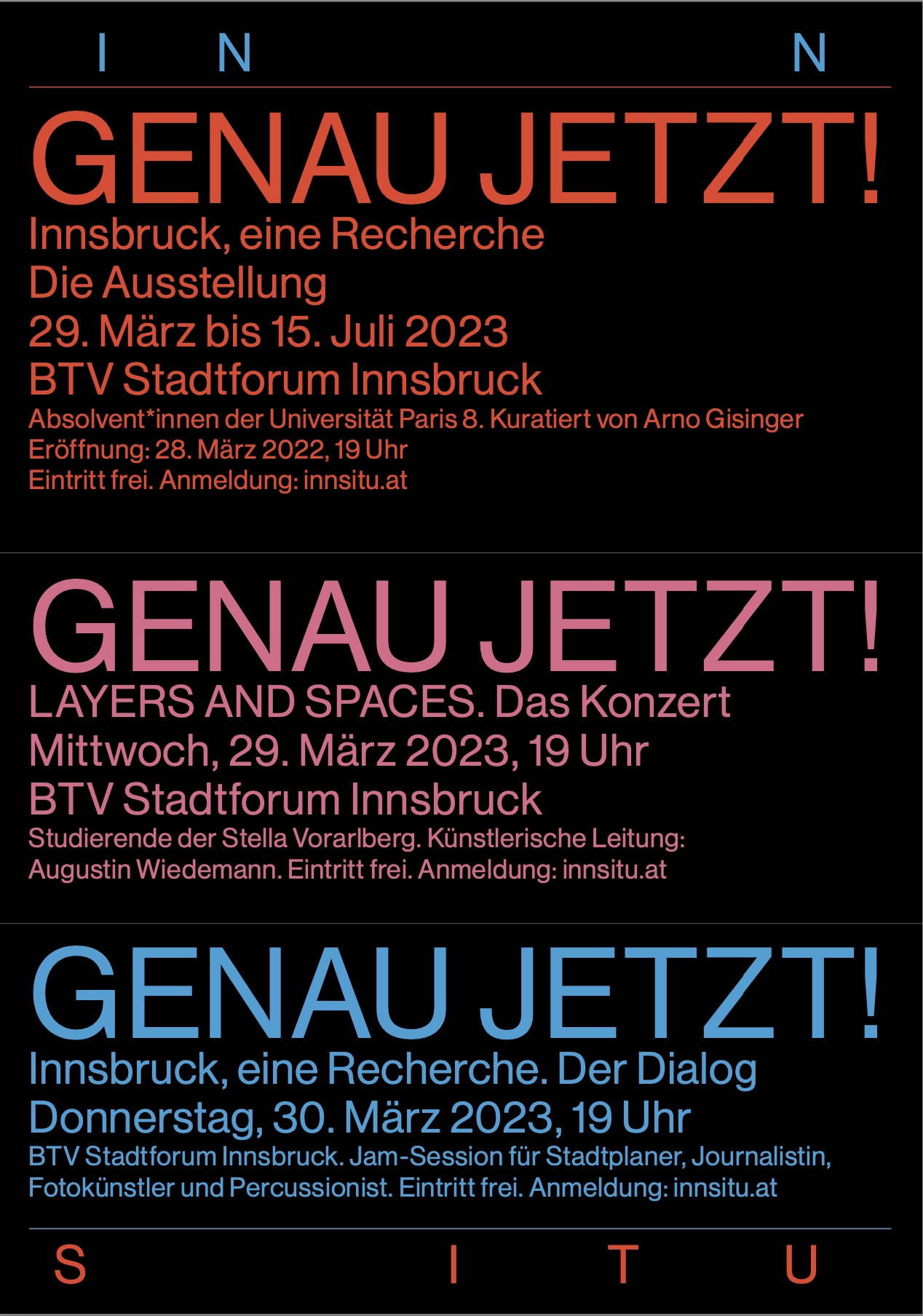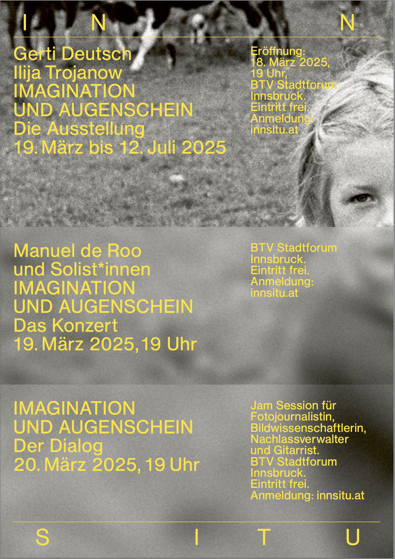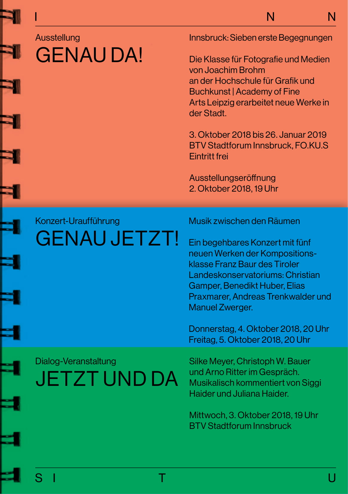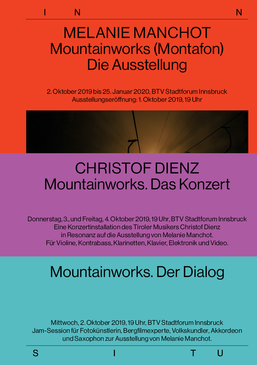 Alle zukünftigen Ausstellungen und Konzerte von INN SITU sind eigens für das BTV Stadtforum entwickelte Arbeiten, die in den Monaten davor hier gestaltet wurden. Die zweisprachige Katalogreihe zu den Ausstellungen erscheint in der Edition Fotohof, Salzburg.
