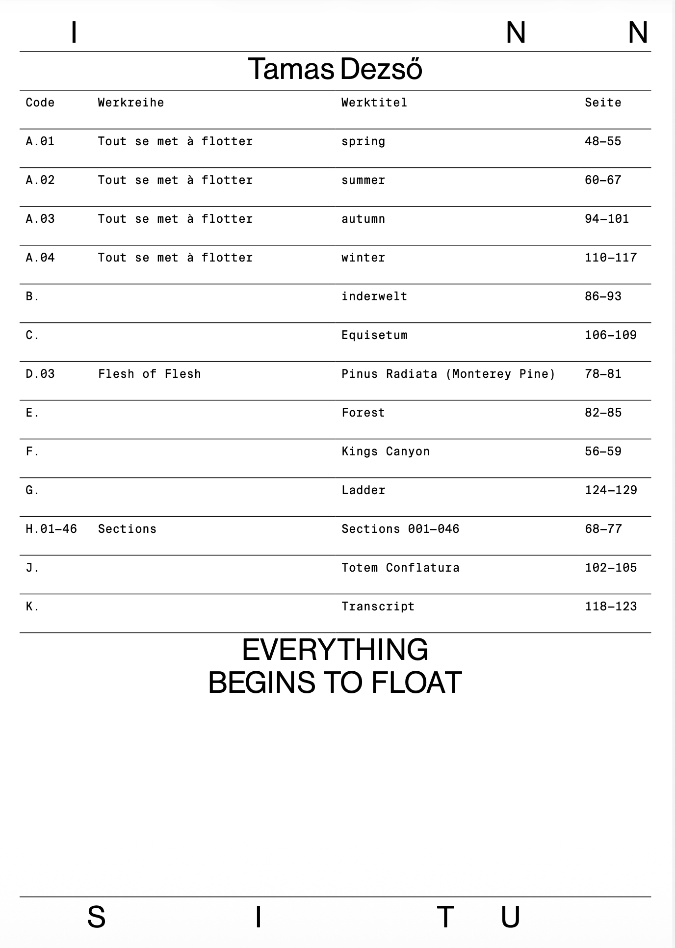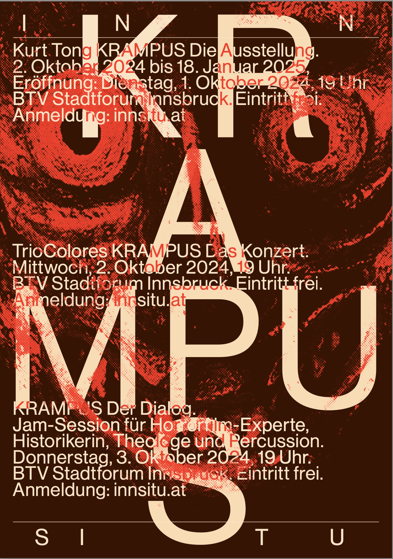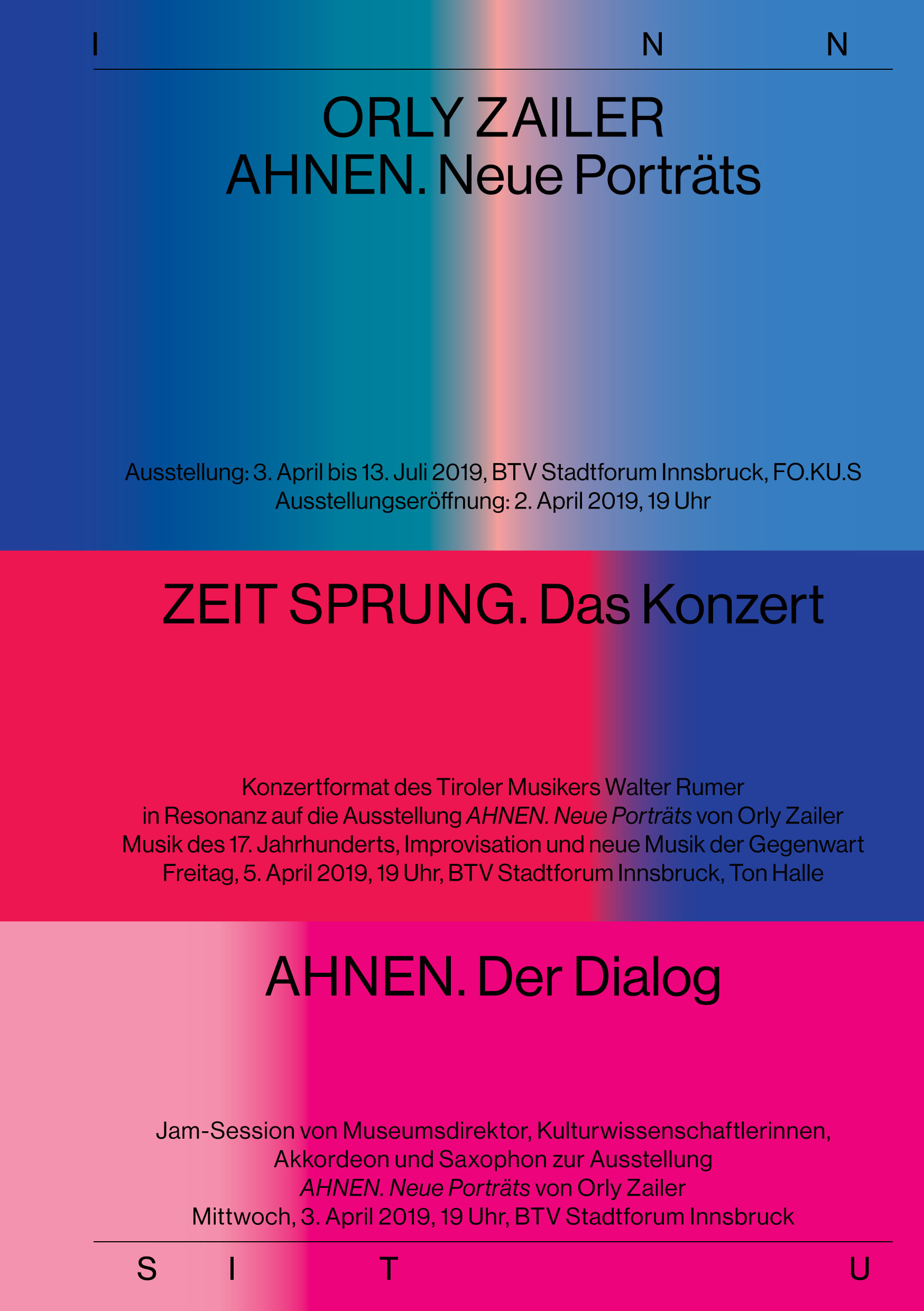 Alle zukünftigen Ausstellungen und Konzerte von INN SITU sind eigens für das BTV Stadtforum entwickelte Arbeiten, die in den Monaten davor hier gestaltet wurden. Die zweisprachige Katalogreihe zu den Ausstellungen erscheint in der Edition Fotohof, Salzburg.