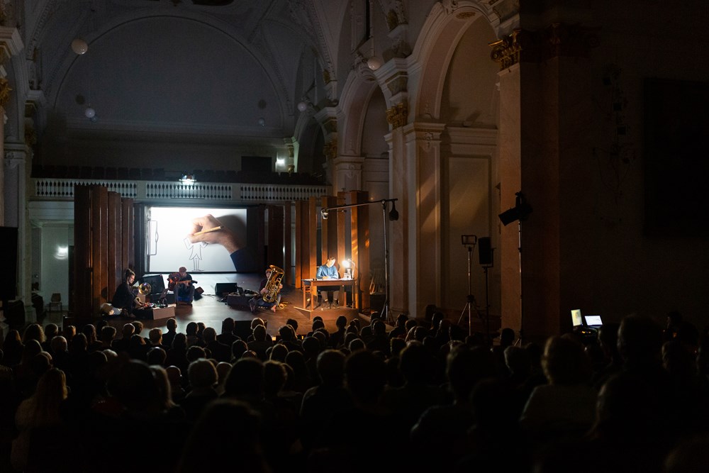 Im Dialog mit drei Musikern aus dem »STEGREIF.orchester« Berlin, das mit seinen Brahms- oder Beethoven-Performances die Klassikszene in Begeisterung versetzt. Eine zauberhaft-minimalistische Ko-Produktion von Strich und Ton. Aus der verheißungsvollen Leere des weißen Blatts und der Stille des Raums.