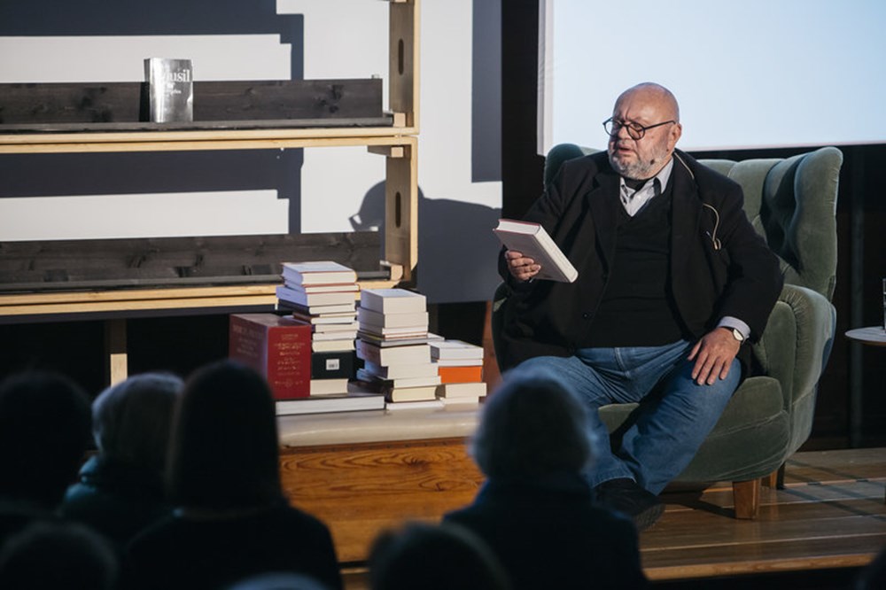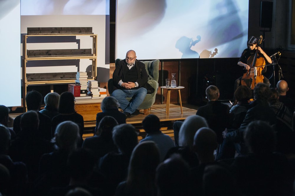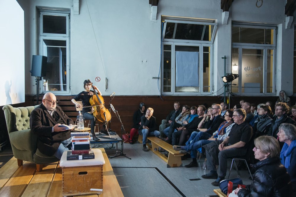 Der renommierte österreichische Essayist Franz Schuh improvisierte über das Thema. Er bewundert, kommentiert, stellt Nachbarschaften her, Wahlverwandtschaften, reiht ein, verbannt, rückt in die Mitte. Auf der Bühne entsteht die physische Spiegelung eines Reflexionsprozesses. Performance als Bildhauerei mit Literatur.