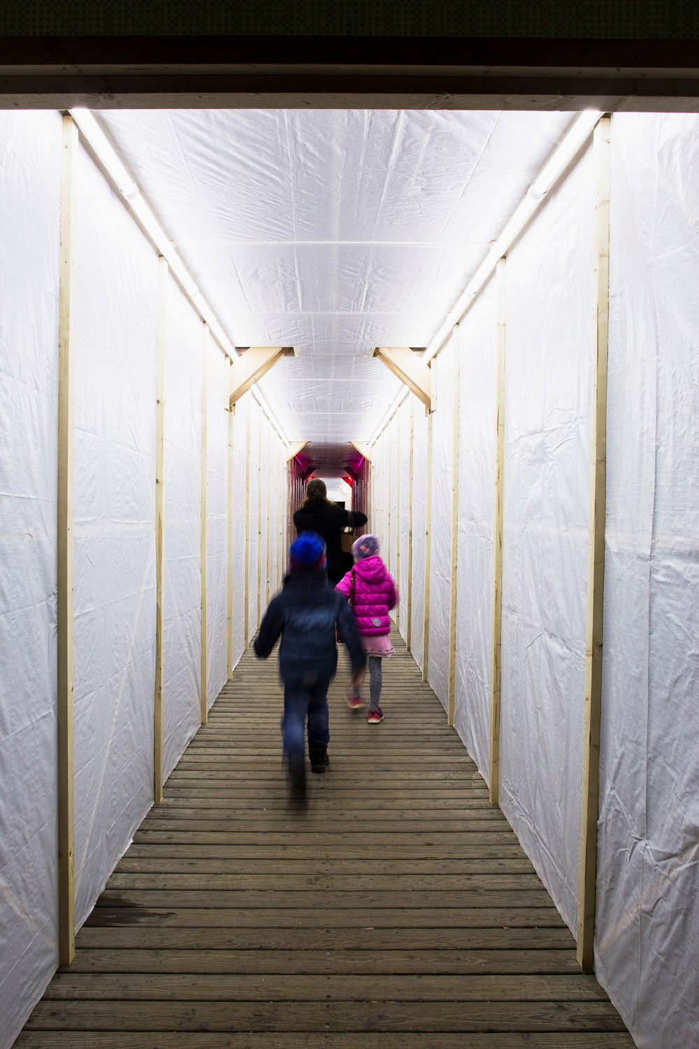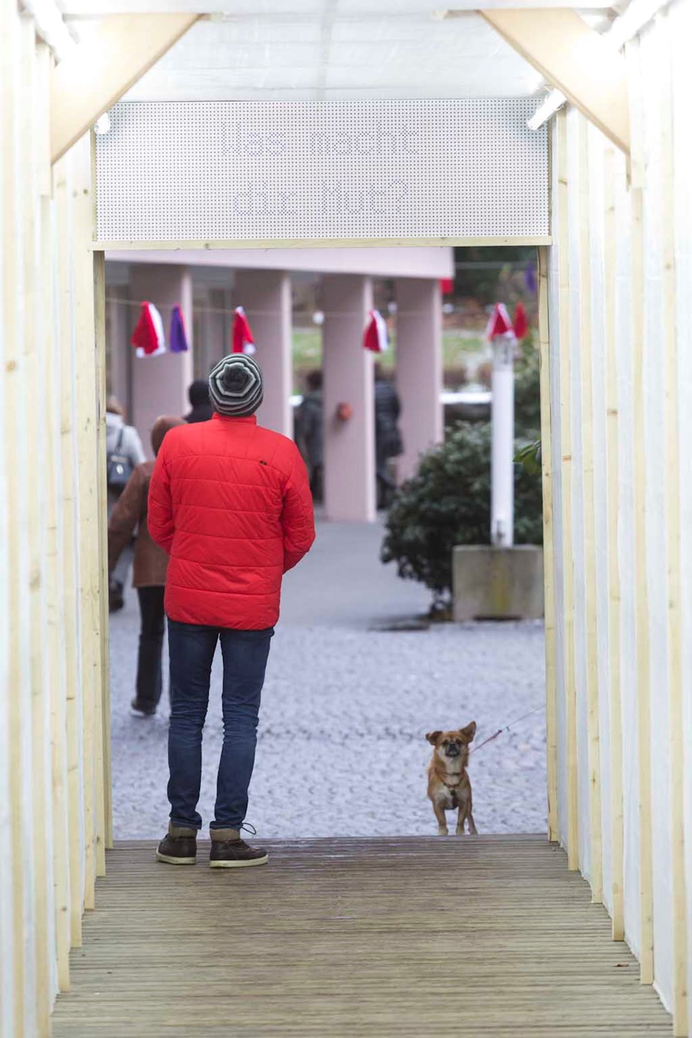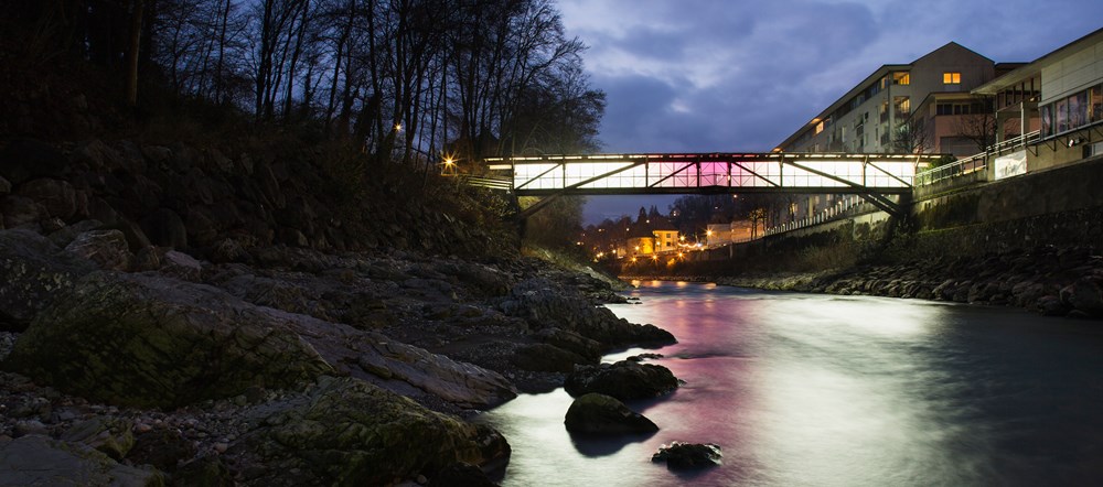 Die Verwandlung einer bestehenden Brücke als kontemplative Rauminstallation. Rund 30 Sekunden benötigt man, um über den hölzernen Ganahl-Steg in Feldkirch von einem Ufer zum anderen zu kommen. 30 Sekunden Zeit für eine Glaubensfrage, die jeweils am Ende der Brück auftaucht. Der Steg führt nach innen.