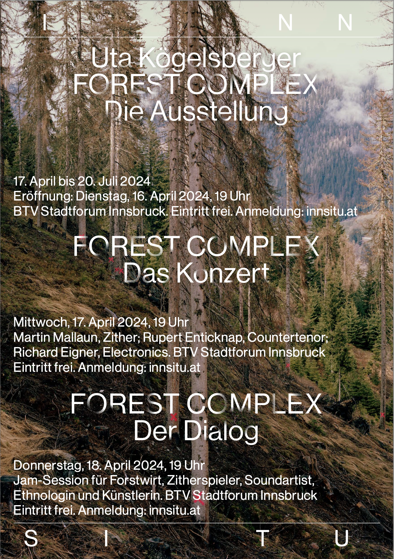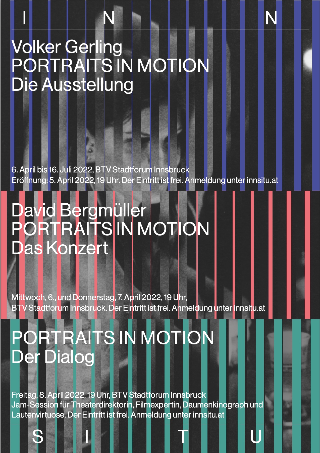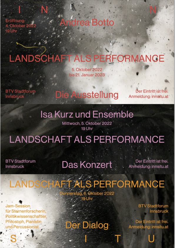 Alle zukünftigen Ausstellungen und Konzerte von INN SITU sind eigens für das BTV Stadtforum entwickelte Arbeiten, die in den Monaten davor hier gestaltet wurden. Die zweisprachige Katalogreihe zu den Ausstellungen erscheint in der Edition Fotohof, Salzburg.